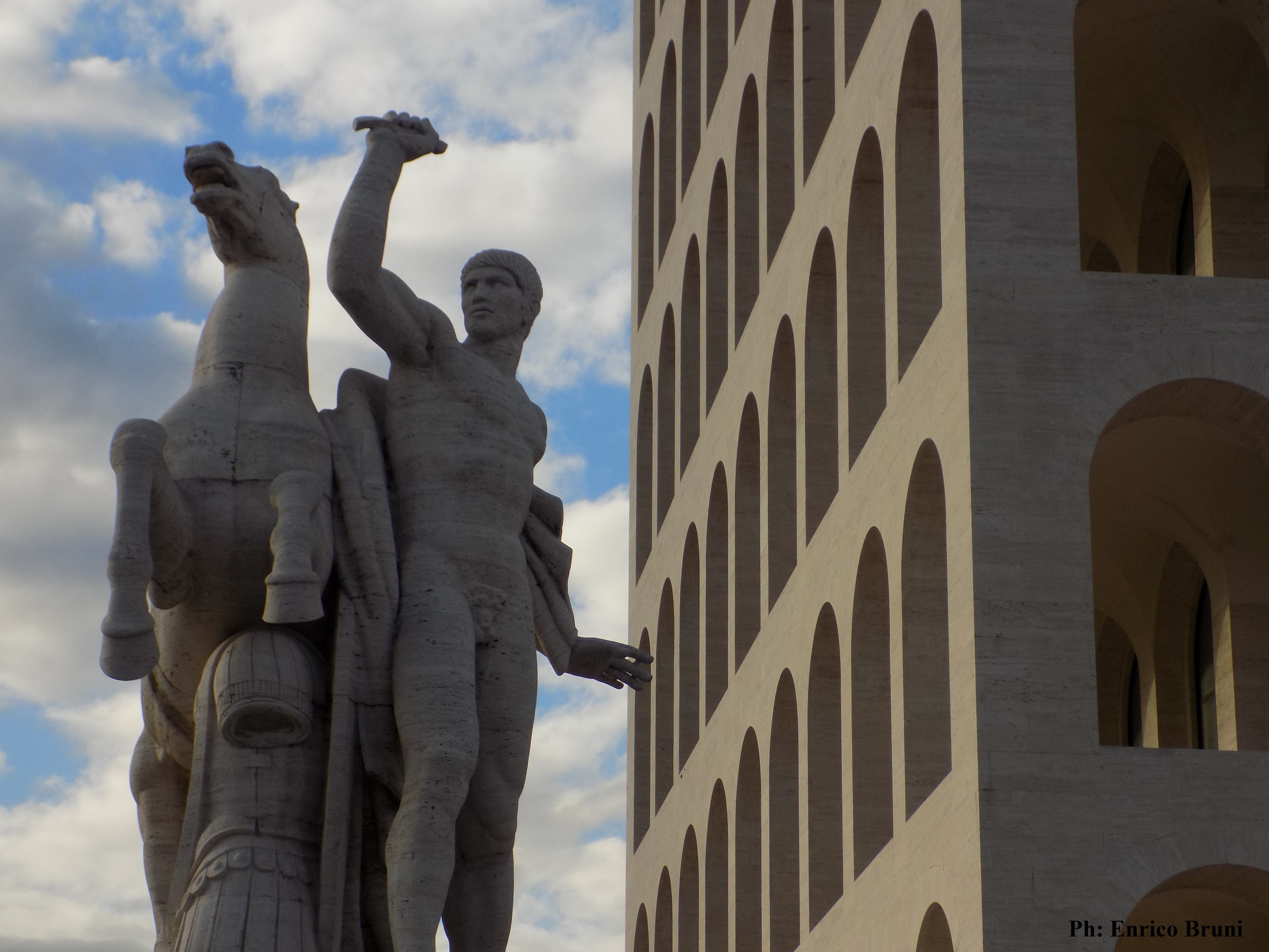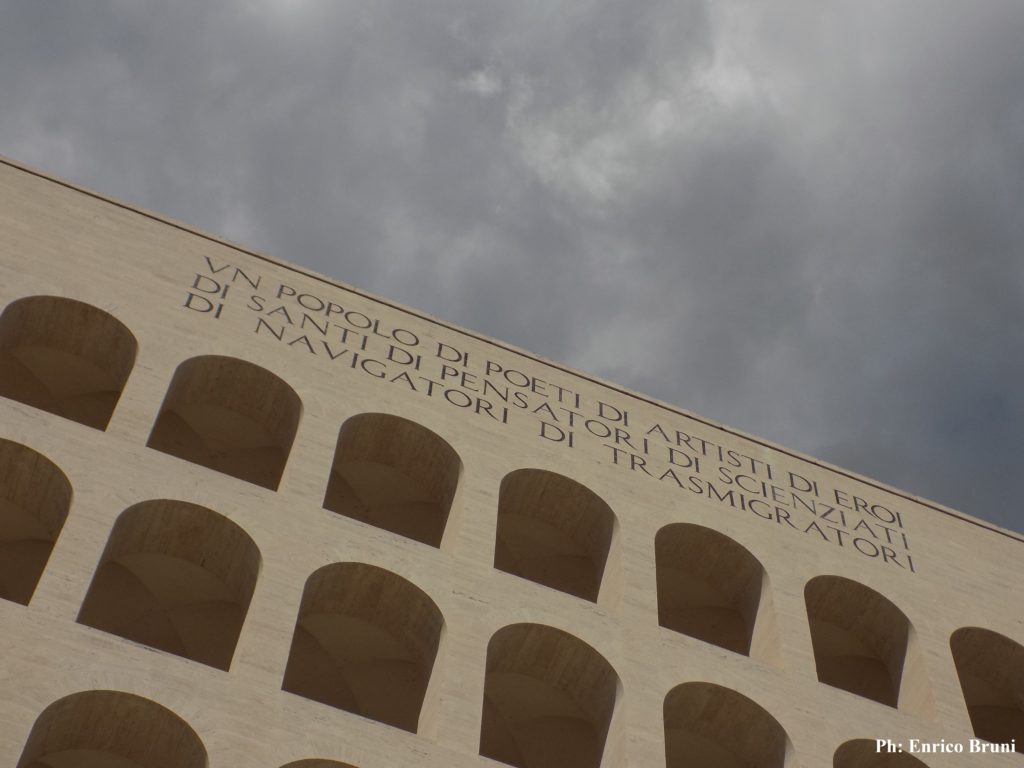 Negli archi del piano terreno si trovano 28 statue in travertino (materiale che oltre a rimandare al mondo dell’antica Roma rispettava anche la politica di autarchia del regime) raffiguranti allegorie delle virtù del popolo italiano. Troviamo quindi l’eroismo, l’agricoltura, la musica, il lavoro, la matematica, l’architettura, etc… Cosa ha portato quindi la professoressa della New York University a una tale critica di questo capolavoro artistico in cui si sintetizzano tutti i canoni del Razionalismo? “Sopra c’è incisa una frase del discorso che Mussolini tenne nel 1935 per annunciare l’invasione dell’Etiopia, in cui descrive gli Italiani come Un popolo di poeti di artisti di eroi / di santi di pensatori di scienziati / di navigatori di trasmigratori “; è palese come l’autrice dell’articolo abbia così ignorato “quel travagliato e complesso lavoro di elaborazione storiografica che per molti decenni ha consentito una concezione meno settaria e rozza del ventennio“(Fulvio Irace) appellandosi a un’epurazione tardiva e dannosa.
