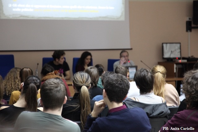 Secondo il programma gli interventi dovevano essere quattro, ma il primo – quello della professoressa di storia contemporanea della Scuola Normale Superiore, Ilaria Pavan – è stato annullato all’ultimo momento dalla professoressa per motivi di salute. Ciò non ha tuttavia compromesso l’evento grazie all’intervento del professor Sodi che ha accettato di sostituire la professoressa Pavan con un intervento sulla situazione italiana in seguito all’emanazione delle leggi razziali, spiegando poi nello specifico ciò che accadde all’indomani del 1938 nella nostra scuola. Abbiamo così scoperto di quanti ragazzi della nostra età siano stati costretti ad abbandonare il nostro liceo lasciando i propri amici e gli studi soltanto perché ebrei. Sono state ricordate le vicende dei fratelli Pontecorvo (i primi proprietari della fabbrica tessile Pontecorvo che diventerà poi il Complesso Marzotto) e quelle di Rafael Emdim (che fa riflettere su come gli ebrei furono traditi dal fascismo con la firma delle Leggi Razziali) che hanno messo in luce come gli italiani si trovarono in un certo senso disorientati di fronte alle discriminazioni razziali del 1938, come se la popolazione fosse stata travolta da un’onda nera di odio che non riuscì né cercò di trattenere. Dopo il professor Sodi ha preso la parola Flavia Dargenio, studentessa del nostro liceo e candidata alla rappresentanza d’istituto, che con un brillante intervento ha collegato passato e presente tramite la poesia “Refugee Blues“. Scritto pochi mesi prima dello scoppio del secondo conflitto mondiale, il canto descrive in maniera drammaticamente realistica la condizione degli ebrei nel Vecchio continente, discriminati e perseguitati, visti come capri espiatori dei mali della società. Flavia ha evidenziato quindi l’attualità di questo testo a causa delle forti manifestazioni xenofobe che si stanno verificando in tutto il vecchio continente: dalla Francia del Front National al Narodowe Odrodzenie Polski in Polonia, dall’“Italia forzanuovista” al Nationaldemokratische Partei Deutschlands in Germania, si assiste a una vertiginosa ribalta di sentimenti neofascisti e razzisti su cui bisogna fermarsi a pensare. L’intervento di Flavia Dargenio si è articolato proprio come una riflessione aperta con gli studenti che hanno partecipato a un dibattito vivace ma gestito dalla stessa Flavia in maniera accurata e strutturata.