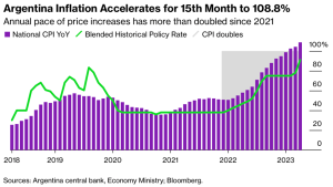 Diversi sono i fattori che incidono anche nel 2023 sull’andamento negativo dell’economia argentina, a partire dagli alti tassi d’interesse, dall’impennata dell’inflazione e dalla frenata dei prezzi delle materie prime sui mercati internazionali, tutte problematiche che hanno portato a un aumento della povertà. La Banca Centrale del Paese informa che il quindicesimo mese consecutivo di aumento ha portato l’inflazione ad aprile di quest’anno addirittura al 108,8%, costringendola a maggio ad aumentare al 97% il tasso di interesse, con la valuta nazionale, il Peso, che nel 2023 ha perso il 35% del suo valore rispetto al Dollaro (grafici 1 e 2).