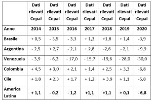 Tabella 1: tassi di variazione percentuali del Pil anni 2014-2015-2016-2017-2018-2019-2020 a prezzi costanti delle principali 5 potenze economiche sudamericane (Fonte: Cepal – Bilancio preliminare delle economie dell’America Latina 2020)